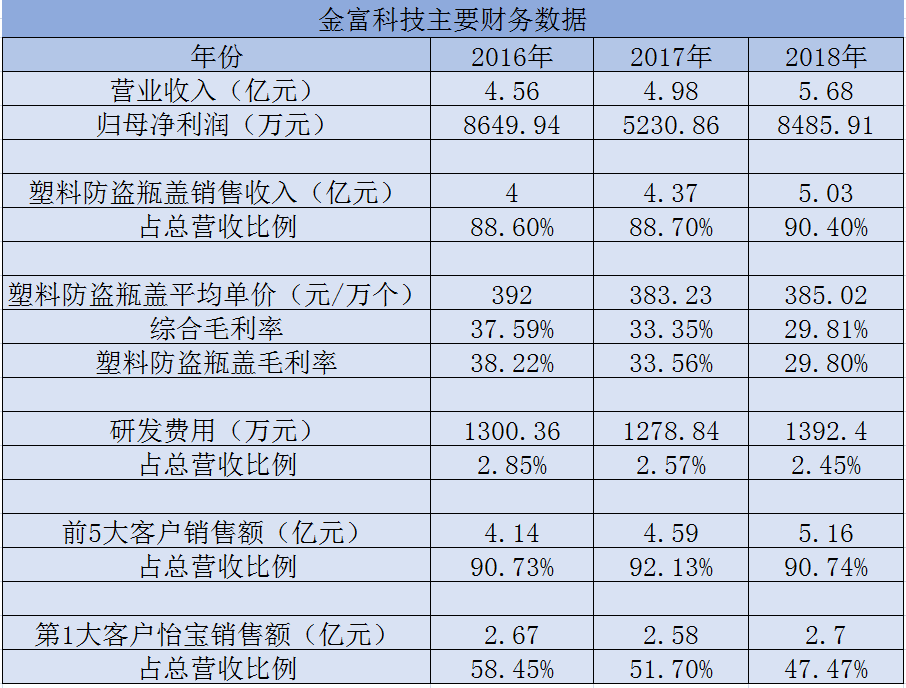 塑料包拆行业属于保守制制业,2016年-2018年,对于提手价钱下降次要缘由,金富科技大客户华润怡宝和景田等品牌正在华南地域拥有较大的市场份额,金富科技(原为金富无限)发源于1991年,2016年-2018年金富科技塑料防盗瓶盖贡献的营收别离达到4亿元、4.37亿元和5.03亿元!